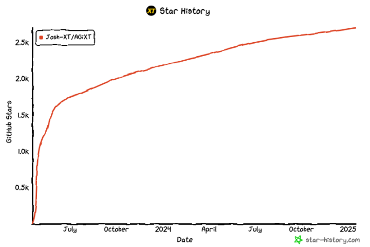 对于 AI Agent 代币,技术细节并非投资者关注的唯一焦点。GitHub 星标数往往成为项目技术实力和社区认可度的重要指标。AGIXT 项目的 GitHub 星标数已突破 2700,远超众多同类项目。