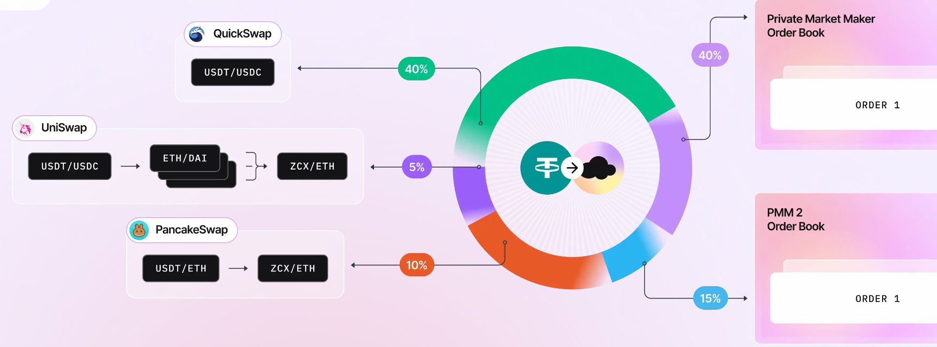 在最新版本的ULDM 中,Unizen 透过整合私人做市商(PMM)的流动性,进一步优化大额订单的执行,ULDM 不仅能够在AMM 流动性池中执行交易,还能将交易分配到PMM 订单簿,确保深度流动性 交易对如ETH 和USDT 的大宗交易能够以更稳定的价格执行,提高交易的准确性和稳定性。
