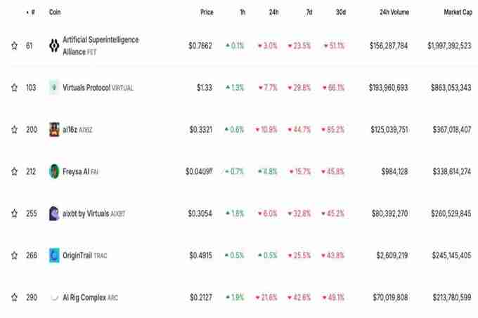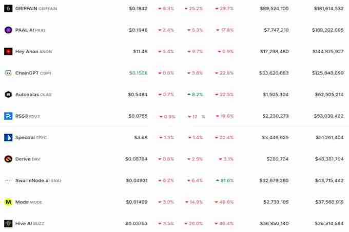 VIRTUAL: 当前价格1.33美元,市值8.6亿美元,24小时跌幅7.7%,一周跌幅29.8%。 a16z: 当前价格0.3321美元,市值3.6亿美元,24小时跌幅10.9%,一周跌幅44.7%。 FAI: 当前价格0.04美元,市值3.3亿美元,24小时涨幅4.8%,一周跌幅15.7%。 AIXBT: 当前价格0.3054美元,市值2.6亿美元,24小时跌幅6%,一周跌幅32.8%。AI Agent衍生的DeFAI领域市值本周也跌至15.56亿美元,虽然部分热门项目受挫,但跌幅相对较小: