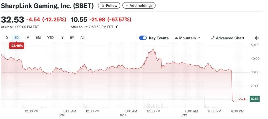 SharpLink盘后股价一度跌至8.75美元,跌幅高达73%,随后小幅反弹至10美元区间。