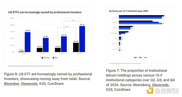 根据 CoinShares 与 Bloomberg 的数据,美国的比特币 ETF 越来越多地被专业投资者所持有,其中金融顾问与对冲基金是主要推动力量。虽然养老金基金目前参与仍有限,但它们一旦入场,可能引发新一轮重大机构采纳浪潮。