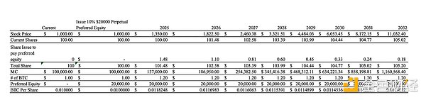 由于每年发行新股支付利息,以及在转换后,总股数会增加。每股比特币价格每年根据更新的比特币总持有量和股数重新计算。到2028年,每股比特币价格已从0.01比特币/股上涨至0.0109874比特币/股,增幅接近10%。这凸显了利用优先股增持比特币的策略如何能够提高每股比特币持有量,即使在考虑到稀释因素后也是如此。
