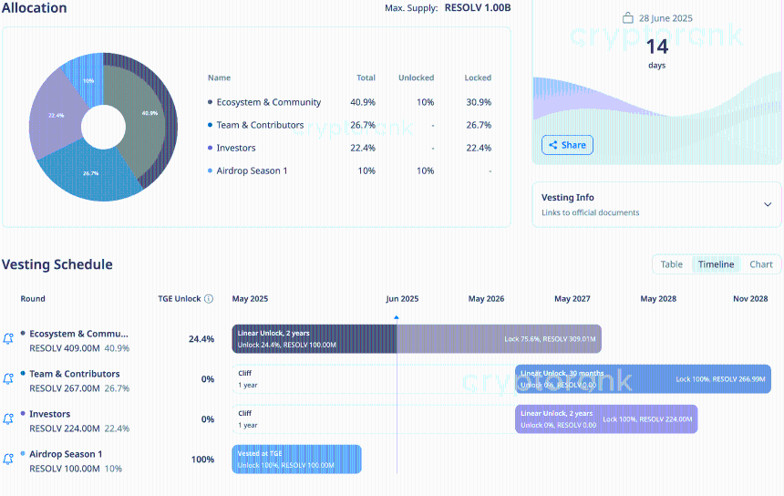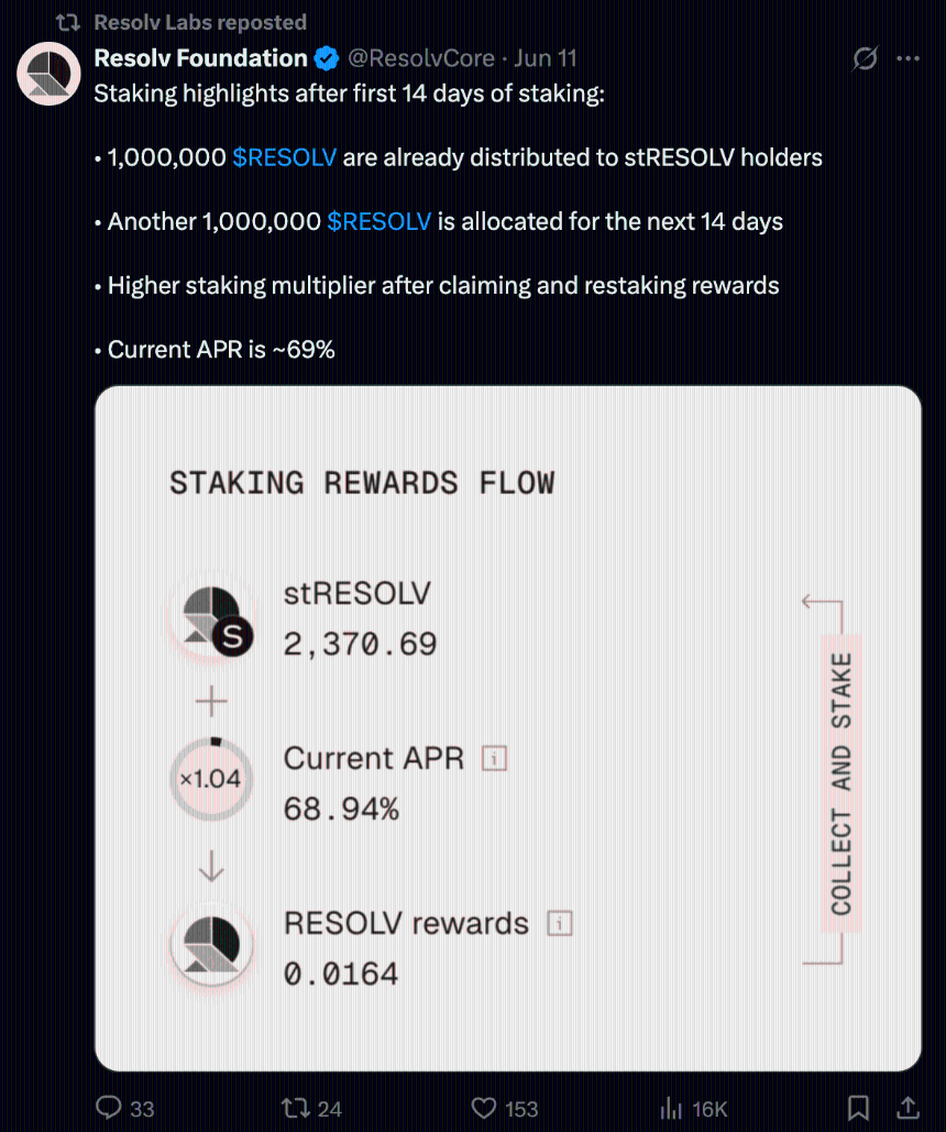 – Season 1 空投:符合条件用户(积分 ≥ 1000)可在 TGE(2025 年 5 月 15 日)后直接在官网领取 stRESOLV, 2 周冷却后可流动。
