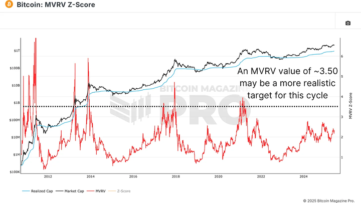 另一个强有力的指标是 MVRV比率,它比较市场市值与实现市值,提供了投资者心理的窗口。该比率在主要周期通常在4左右达到顶峰,目前为2.34,表明仍有显著上涨空间。历史上,当MVRV接近3.5至4时,长期持有者开始实现可观收益,通常标志着周期成熟。然而,由于回报递减,我们本周期可能无法达到完整的4。使用更保守的3.5估计,我们可以开始预测更现实的峰值。