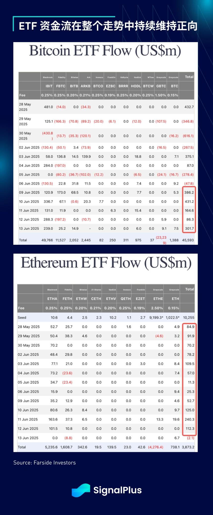 BTC ETF净流入达14亿美元,而ETH ETF则刚刚打破了连续两周以上净买入的纪录,显示传统金融机构的参与度仍然良好。我们预计,随着夏季来临,加密货币价格将继续跟随股市情绪缓步上行。