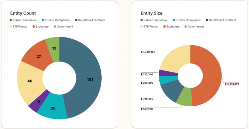 比特币ETF已成为机构投资者的强劲力量,截至本文撰写时,其控制着1,390,267个比特币,价值约1500亿美元。上市公司的ETF持有765,300个比特币,私营公司的ETF持有285,292个比特币。这些机构投资者的集中持有反映了机构投资者越来越多地将加密货币用作投资组合多元化策略。