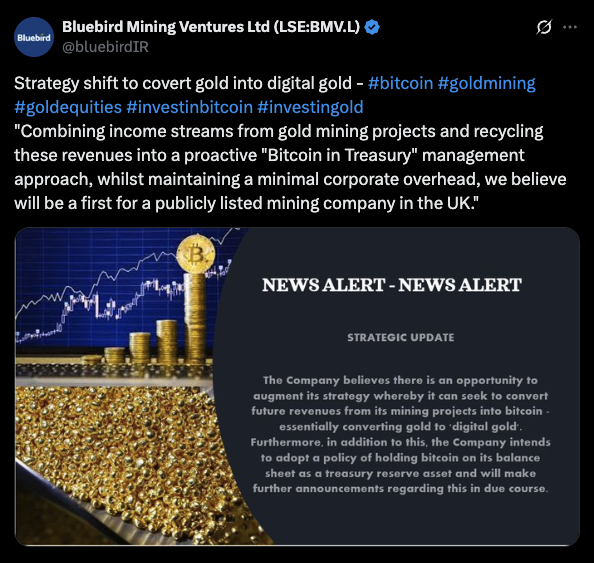 英国上市金矿公司Bluebird计划将黄金收入转为比特币储备 币圈网报道: 英国上市的黄金矿业公司 Bluebird 宣布计划将其从黄金中赚取的资金用于建立比特币储备。 该公司通过 X 平台发布简短新闻稿披露了这一消息。随后,非执行董事长乔纳森·莫利·柯克 (Jonathan Morley-Kirk) 在声明中提供了更多细节。 蓝鸟在X上 Bluebird 着...