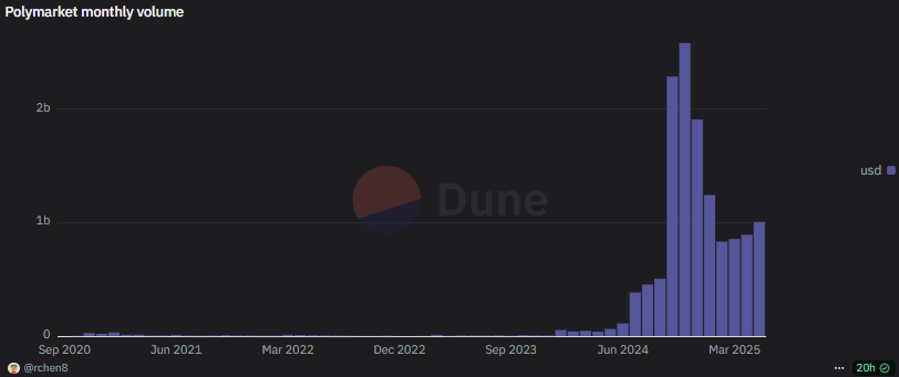 Polymarket 5月交易量突破10亿美元,展现强劲复苏势头 币圈网报道: 多元化市场连续四个月上涨,市值重回10亿美元上方。该预测平台依然保持领先地位,正在为选举后的复苏寻找新的市场。 Polymarket预测平台已连续四个月扩张。5月份,该平台交易量自1月份以来首次突破10亿美元大关。尽管没有空投,Polymarket仍然是加密货币领域的主流,并实现了有机...
