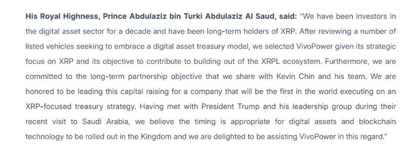 纳斯达克上市公司 VivoPower 宣布基于 XRP 的加密资产战略并获沙特王室支持 币圈网报道: 纳斯达克上市公司 VivoPower International 推出了据信是全球首个基于 XRP 的加密资产财务策略。 具体来说,该公司通过由沙特阿拉伯王子阿卜杜勒阿齐兹·本·图尔基·阿卜杜勒阿齐兹·阿勒沙特牵头的私募融资1.21亿美元。该公司股价报6.05美元,高于纳斯达克上次收盘...