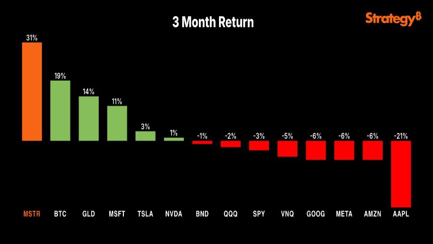 Michael Saylor发布投资回报率图表:MSTR表现优于比特币及主流科技股 摘要 2025年5月24日,迈克尔·塞勒(Michael Saylor)发布了两张业绩图表,比较了主要资产三个月和一年的回报率。这篇帖子分享在他的X账户上,并配文称…… 。 币圈网报道: 2025年5月24日,MicroStrategy联合创始人迈克尔·塞勒(Michael Saylor)在其X帐户...
