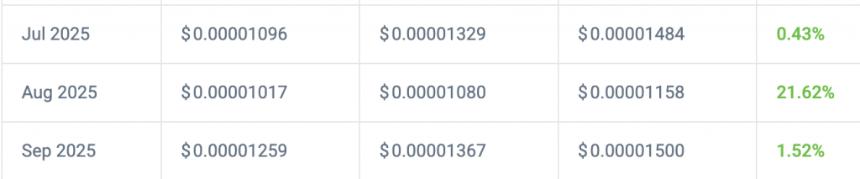 根据CoinCodex的数据,预计2025年第三季度柴犬币市场将呈现较为看涨的趋势。具体而言,7月可能成为下一季度表现最佳的月份,SHIB价格有望触及0.00001484美元的高位。然而,8月可能出现重大回调,价格或跌至0.00001158美元的低点。最终,9月的价格可能回升至0.00001500美元左右。