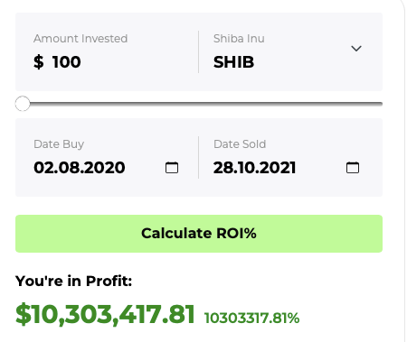 SHIB 于 2021 年 10 月 28 日创下 0.00008616 美元的历史新高。如果您在该资产价格最高时卖出价值 100 美元的 SHIB,您将获得 1030 万美元的利润。在这种情况下,您的投资将增长 10,303,117%(1030 万个百分点)。