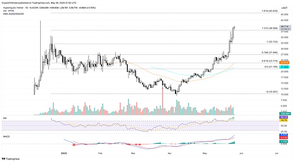 Hyperliquid 当前交易价格为 39.80 美元,周一单日上涨 1.70%,创下历史新高。周日的 12% 涨幅形成了一根看涨吞没 K 线,突破了 1.272 斐波那契回撤水平。这一水平曾是去年 12 月 21 日至今年 4 月 5 日暴跌幅度的 70% 回撤点。