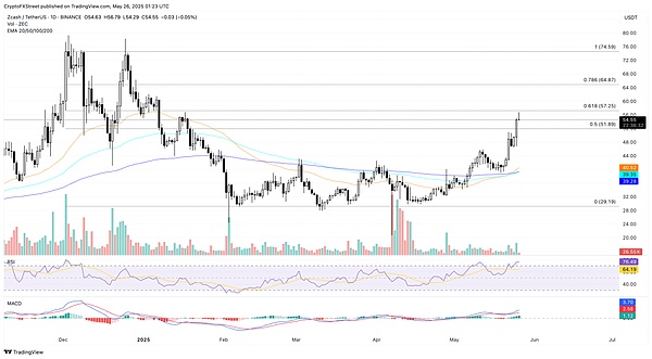 根据 Lunarcrush 数据,ZEC 的社交提及次数达到 1.51 万次,独立提及接近 1,000 次。斐波那契回撤分析显示,若突破 57.25 美元阻力位,下一目标将指向 64.87 美元。