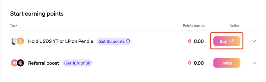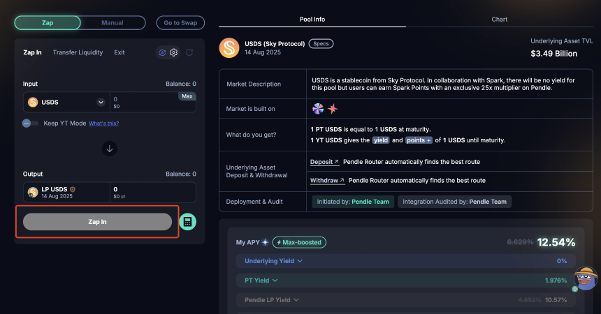 简单来说,除了“嘴遁”刷 Cookie Snaps 之外,目前最高效的刷分策略是直接在 Pendle 上参与 USDS 的 LP,大家可以通过 Spark 的前端(传送门:https://app.spark.fi)直接进入该界面,之后直接存入(Zap In)预期金额(不一定非要存入 USDS,Pendle 会处理兑换)即可,积分会自动累计。