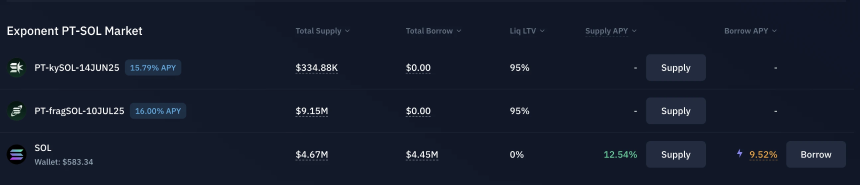 Solana 生态中的另一个 Pendle 类项目 Exponent 昨日宣布与 Kamino 达成合作,以将其 PT 资产引入 Kamino 的借贷市场,目前已上线的资产包括 PT-fragSOL、PT-kySOL。