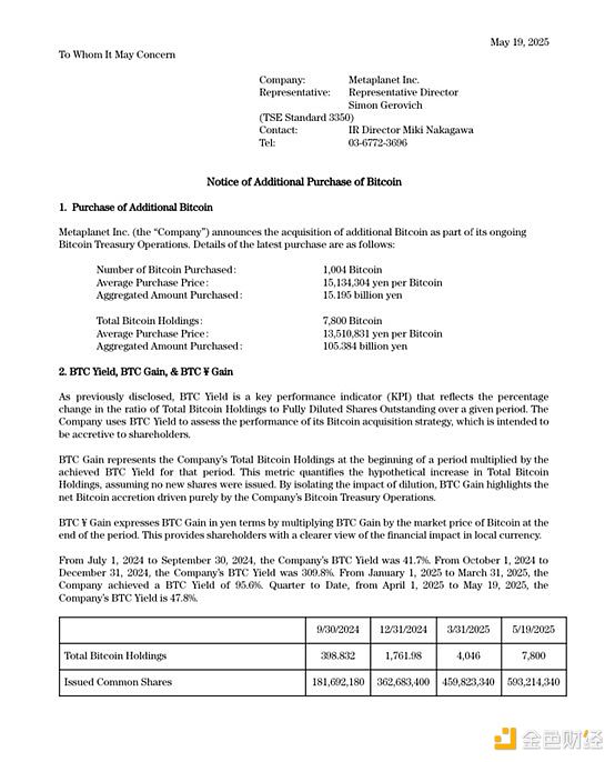 5月19日,Metaplanet再次购入1004枚比特币,总金额达151.95亿日元(约合1.06亿美元),单枚均价约1513万日元。截至目前,公司累计持有7800枚比特币,历史平均购入价为1351万日元(约合9.46万美元)/枚。