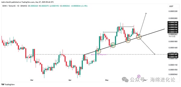 从看涨角度看,每次 BONK 触及该支撑位时都会出现反弹。