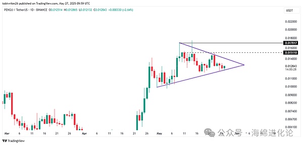 最后,截至发稿时,PENGU 的表现较弱,似乎正在对称三角形的下部支撑位盘整。