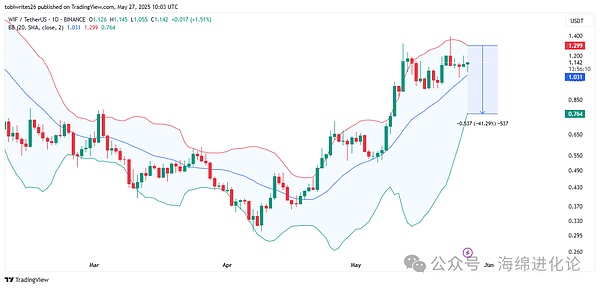 布林带分析表明,WIF 在大幅下跌之前可能会出现短暂的反弹。