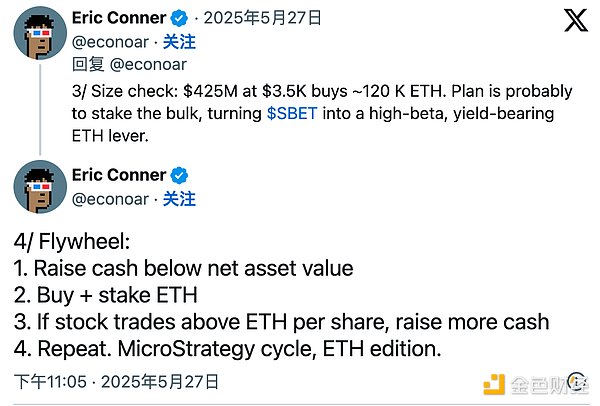 举个例子:如果 $SBET 的交易价格高于其每股持有的 ETH 价值,那这个“溢价”就能成为筹资的来源——公司可以据此融资更多,购买更多 ETH,加速飞轮效应。