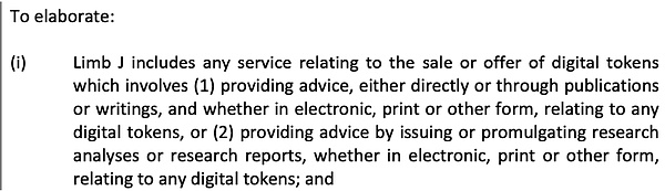 "任何与数字代币销售或要约相关的服务,包括:(1) 直接或通过出版物、文章等任何形式(电子、印刷或其他形式)提供与数字代币相关的建议,或 (2) 通过发布或传播研究分析或研究报告(电子、印刷或其他形式)提供与数字代币相关的建议"