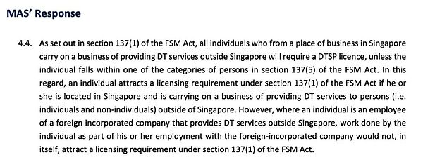 “根据《金融服务和市场法》第137(1)条的规定,所有在新加坡营业场所从事向新加坡境外提供数字代币服务业务的个人都需要获得DTSP许可证,除非该个人属于《金融服务和市场法》第137(5)条规定的某一类人员。在这方面,如果个人位于新加坡并从事向新加坡境外人员(即个人和非个人)提供数字代币服务的业务,则该个人需要根据《金融服务和市场法》第137(1)条申请许可。但是,如果个人是向新加坡境外提供数字代币服务的外国注册公司的雇员,该个人作为其在外国注册公司就业的一部分所从事的工作本身不会触发《金融服务和市场法》第137(1)条下的许可要求。”