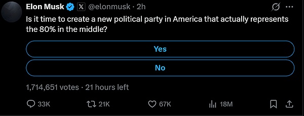 他还直接在X平台上发起了一项投票,提出建立真正代表80%美国中产的新政党。该投票获得了180多万回应,其中超过82%同意他建立新政党的主张。