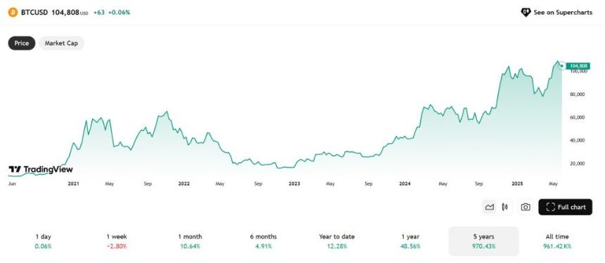 五年前的2020年,柴犬币的交易价格仅为0.00000000097美元(九个零),而比特币的价格为9,750美元。到2025年,柴犬币价格飙升至0.0000126美元,而比特币的价格则徘徊在104,700美元左右。