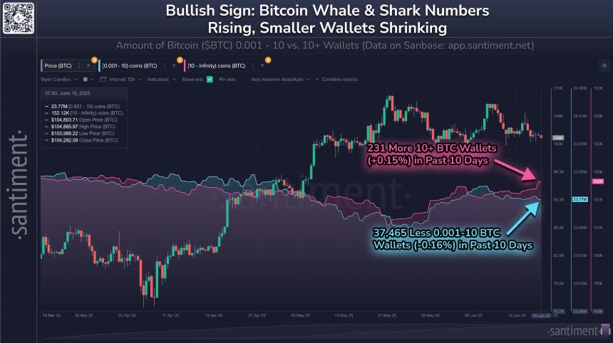 比特币鲸鱼逆势增持:市场情绪分化预示价格或将反弹 币圈网报道: 过去十天,比特币鲸鱼钱包数量持续增加,而散户投资者则选择抛售,这一历史性的看涨信号引发了市场关注。 根据市场情报平台 Santiment 的数据,这种市场情绪的分化在近期尤为明显。周四,比特币价格徘徊在 105,000 美元左右。本周初,比特币曾一度上涨至 109,000 美元,但随后...