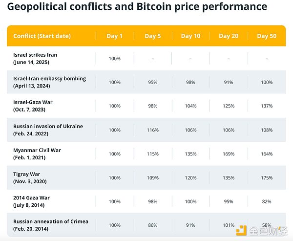 BTC价格在地区冲突中企稳 或转变对战争反应 作者:Aaron Wood,来源:Cointelehraph,编译:Shaw 金色财经 随着以色列和伊朗之间的冲突不断升级,比特币的价格却保持稳定。回顾以往的冲突事件,可以看到类似的趋势,比特币的采用率和机构参与等因素发挥了关键作用。Bitwise 旗下 ETP 平台 ETC 集团研究主管André...