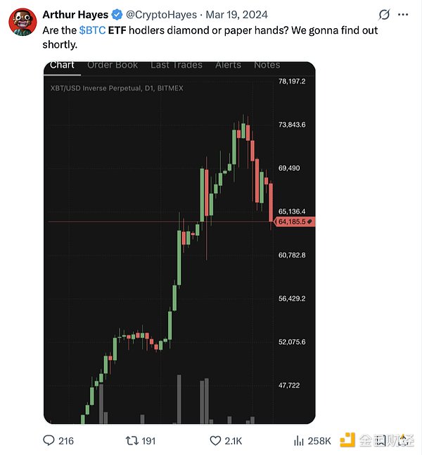 Arthur Hayes 曾表示:“是时候交易一些狗屎 Meme 币了。”同样,去年 3 月,Hayes 称比特币会在重新测试 76500 美元之前涨至 110000 美元。但仅仅一个月后,即 4 月 9 日,比特币就跌至 76500 美元。