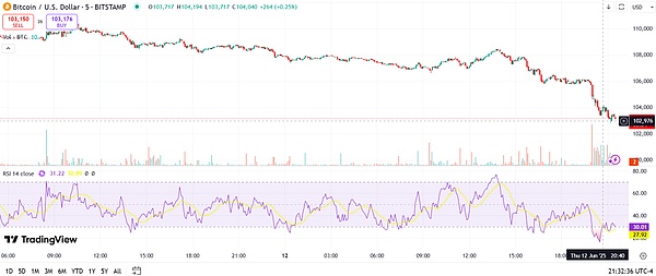 以色列对伊朗军事目标的空袭加剧了中东地区的紧张局势,导致风险资产普遍遭到抛售,比特币价格在周五早间下跌超5%。根据TradingView数据,全球最大加密货币从24小时高点108,500美元跌至102,900美元。