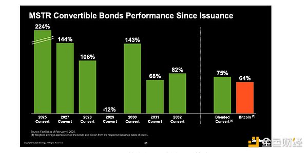 这种结构对于寻求长期持有比特币并降低风险的机构尤其具有吸引力。此外,一些受监管规定限制无法直接购买比特币的机构仍然可以通过投资这些可转换债券获得间接投资。随着比特币价格上涨,Strategy 的股票通常也会升值,这使得债券持有人可以将债券转换为股票,从而获得上涨收益。即使在下跌的情况下,投资者仍然可以获得本金和利息,从而提供更均衡的风险回报。从历史上看,这些可转换债券的表现甚至超过了比特币的现货表现。