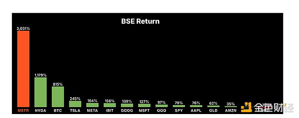 自 2020 年起,公司开始将比特币作为其核心的金库资产进行大规模配置。得益于这一策略,其股价表现已超越所谓“七大科技巨头(Magnificent Seven)”中的所有成员,成为过去几年表现最好的股票之一。