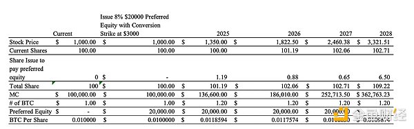 每年,优先股的8%利息将通过发行新的MSTR股份支付给STRK股东。优先股的转换价格为3,000美元。到2028年,股价达到3,321.51美元,触发2万美元优先股全部转换为普通股。
