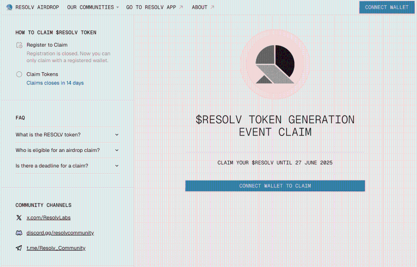 – Season 1 空投:符合条件用户(积分 ≥ 1000)可在 TGE(2025 年 5 月 15 日)后直接在官网领取 stRESOLV, 2 周冷却后可流动。