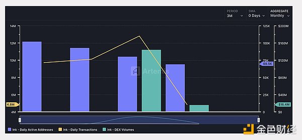 Ink 的整体指标增长有限但存在隐忧:TVL 在 2025 年上半年增长 46%,达到 755 万美元,但起点较低。尽管维持了约 7.5 万个活跃地址,交易量却在近几个月下降了 71%。DEX 月交易额曾在 4 月短暂飙升至 1.45 亿美元,随后暴跌 92% 至 1174 万美元。