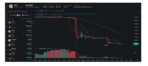 在此背景下,ZKJ和KOGE成为流动性提供者的宠儿。两者因高年化收益与稳定波动吸引了大量Alpha用户,TVL一度突破3000万美元。然而,6月15日晚,三大主要地址通过撤池与抛售操作完成了定点爆破,ZKJ与KOGE双双暴跌80%,彻底击穿市场信心。