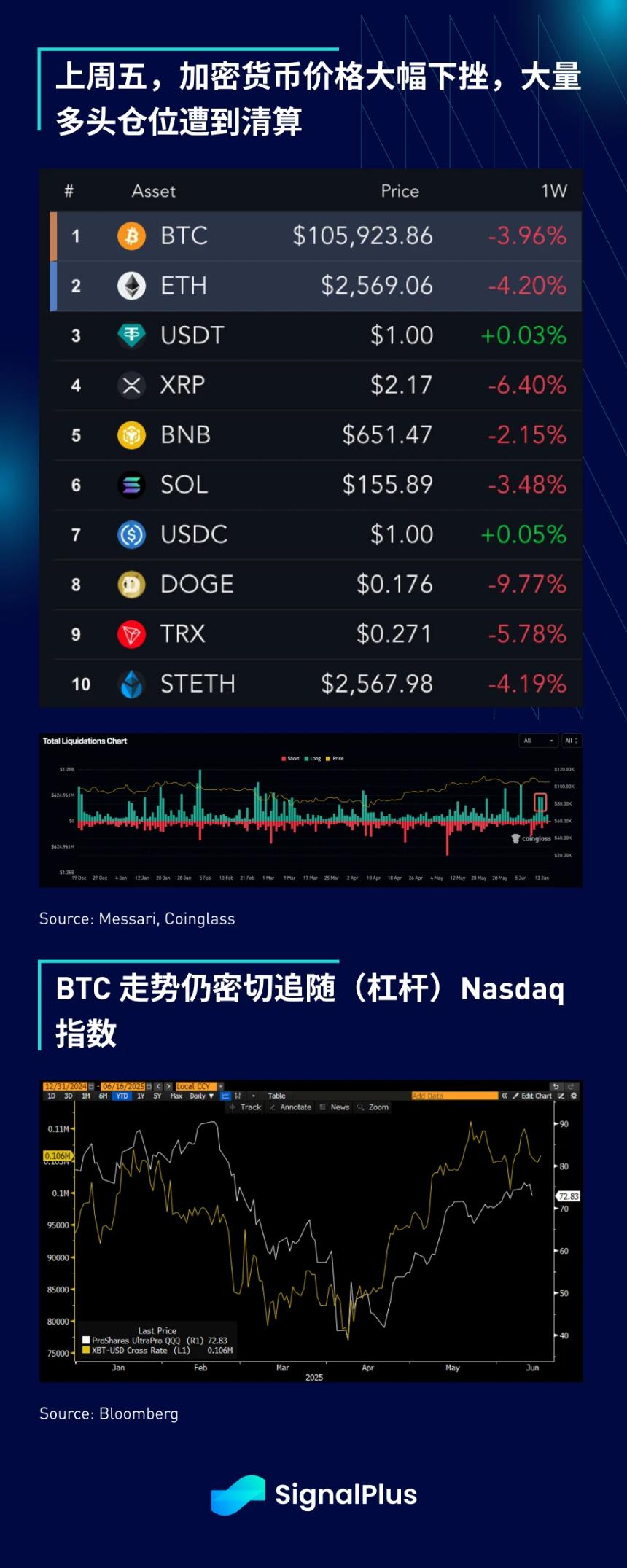 加密货币市场则再次验证了其“高风险资产”的定位。上周,各类代币价格全面下挫,超过12亿美元的期货头寸遭到清算。尽管如此,BTC在稳定的ETF资金流入和上市公司持币支持下,价格回到105,000美元附近。
