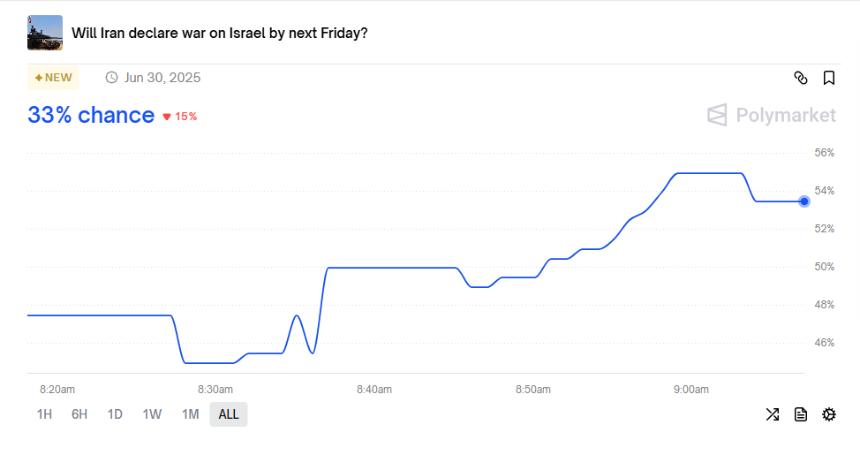 预测市场显示以色列或将发动先发制人打击,新赌注聚焦伊朗潜在回应 币圈网报道: 预测市场平台 Polymarket 数据显示,在以色列战斗机周五凌晨对伊朗发动大规模军事行动的两天前,已有投资者押注以色列将对伊朗采取军事行动。昨日数据显示,以色列袭击伊朗的可能性被评估为 60%。 在袭击消息传出后,Polymarket 平台上出现了多笔新的投注,参与者倾向于认为伊朗...