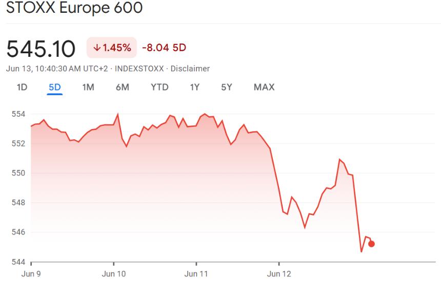 以色列空袭伊朗引发市场震荡:欧洲股市重挫,美国国债收益率下滑 币圈网报道: 周五开盘,欧洲股市大幅下跌,因以色列对伊朗发动袭击后投资者转向避险资产。与此同时,由于地缘政治紧张局势加剧,美国国债收益率有所下降。 截至格林威治标准时间08:56,欧洲斯托克600指数下跌1.45%,至545.10点。这标志着该基准指数连续第五个交易日下跌,表明本周指数已出现明显回落...