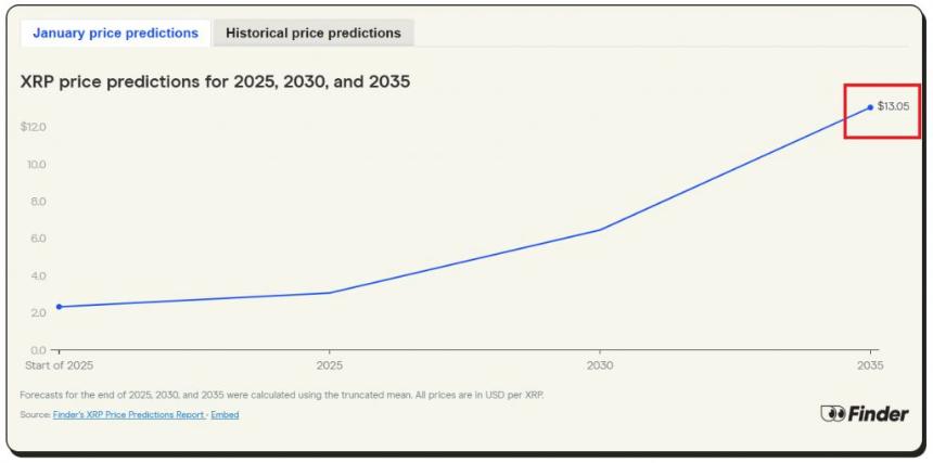 “我们的小组成员认为,到 2025 年底,瑞波币 (XRP) 的平均价值将达到 3.06 美元,比 2025 年初的 2.32 美元高出 32%。我们的小组成员还预测,到 2030 年底,XRP 将升至 6.45 美元,到 2035 年底将升至 13.05 美元。”来自 Finder 的预测。
