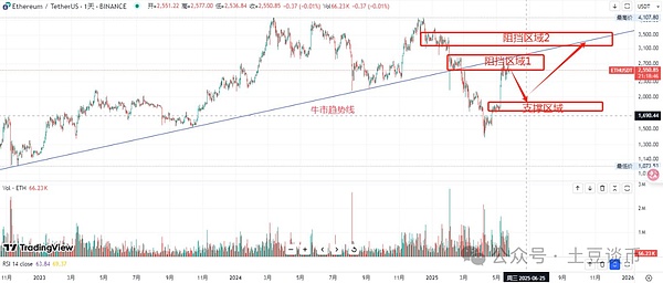关于以太坊后续走势的一种猜测:年初跌破牛市线后反抽至此,遇阻挡区1。短期内突破区域1的概率较小,或先回调再涨,测试牛市线后受阻挡区2(3100-3500)压制。突破区域1已不易,区域2更难,套牢盘压力巨大。
