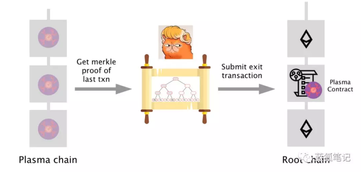 他拿到了token的历史记录,以证明所有权,并将记录放入提交到 Plasma 合约的退出请求中。他的退出交易还包括gas费和作为抵押的保证金(以防止撒谎)。当一切停当,如果没有人挑战Donald,他能在根链上用PETH赎回ETH。