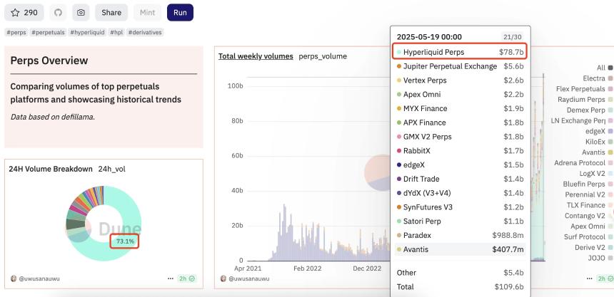据Dune数据显示,5月19日至5月25日期间,Hyperliquid平台合约交易量高达787亿美元,占市场总交易量1096亿美元的71.8%。此外,24小时交易量占比高达73.1%,7日交易量增幅约为46%,30日交易量增幅约为20%,位列加密市场合约平台第一名。