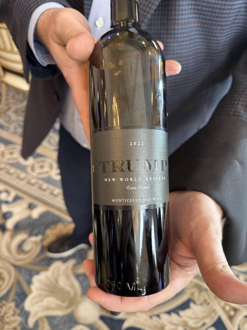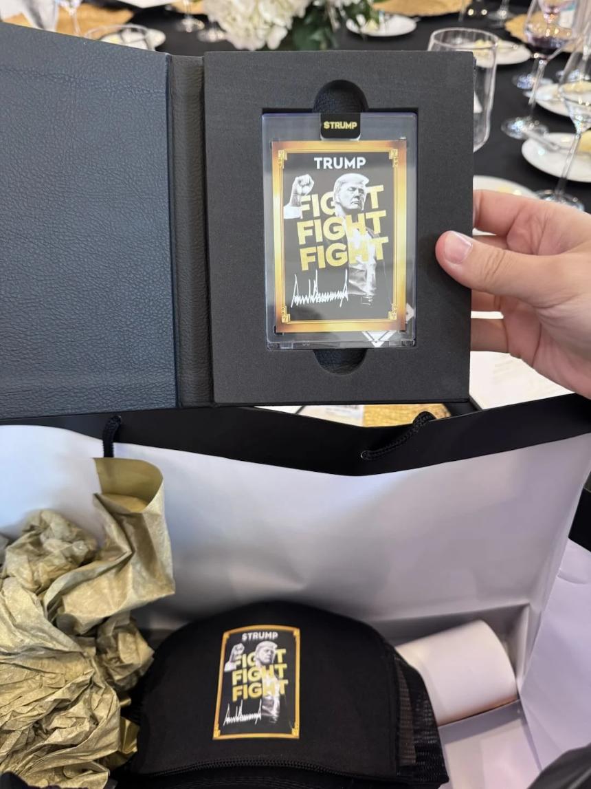 Sheldon:整个会场“特朗普”元素还是很多的,有非常强的个人 IP 效应:现场有很多特朗普标志性的“FIGHT”立牌,还有一个签名版可以给大家签名;喝的酒是“Trump”品牌,吃的牛排以及蔬菜也是“Trump Organic”(特朗普有机食品),这次宴会的庄园也是特朗普旗下的。