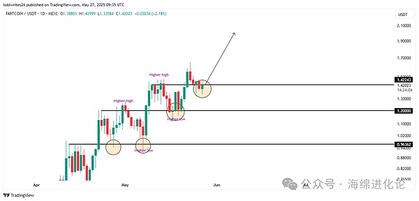自 4 月份上涨以来,FARTCOIN 一直遵循分形路径,形成更高的高点 (HH) 和更高的低点 (HL)。