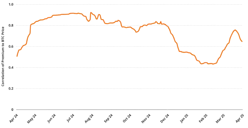 MSTR 的溢价与比特币价格之间表现出明显的正相关关系。在过去一年中,其与 BTC 的相关系数为 0.52 (T-Stat = 9),与 BTC 的近似 Beta 系数为 1.77 。这表明随着比特币价格上涨,溢价往往会扩大,从而进一步增强 MSTR 的股票表现。BTC 价格、投机行为、融资能力和 MSTR 估值之间的联系形成了一个自我强化的循环,这是公司战略的核心。