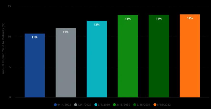 最具吸引力的目标是 2029 年 12 月 1 日的债券(+ 31% 上行)和 2030 年 3 月 1 日的债券(+ 26% 上行)。鉴于 2030 年 3 月 1 日的债券更接近期权的实值区域,其信用利差转化为 Saylor 所定义的“BTC 信用”以及其高期权价值的结合可能对勇敢的投机者具有吸引力。然而,对于传统的长线投资者而言,这些债券包含的风险敞口可能过于复杂难以管理。相对而言,我们认为它们不如 MSTR 资本结构的其他部分具有吸引力。